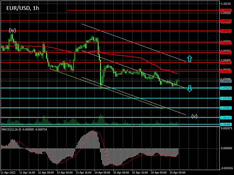 Forex strategy for the euro/dollar pair on 19/04/2022 The euro/dollar pair is traded on an hourly chart within a downtrend. It shows that the euro/dollar exchange rate is trading below the level of the moving average with a period of 55 on the hourly chart (the level of 1.0807), which disposes to lower prices in the short term. I recommend working from sales within the framework of this wave model.