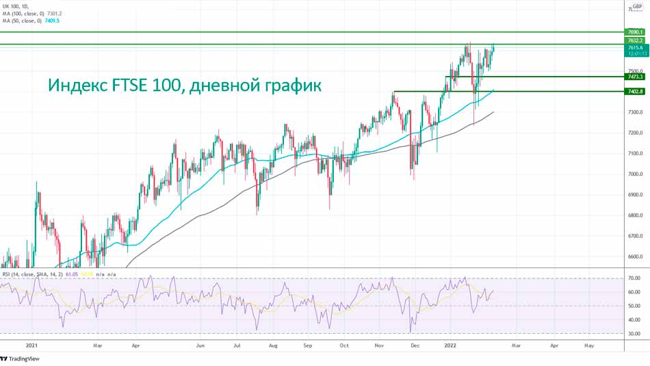 Индекс FTSE продолжает отскок от 100 sma, восстанавливая 50 sma и обновляя свой постпандемический максимум 7635. Однако движение выше столкнулось с сопротивлением на этом уровне.
