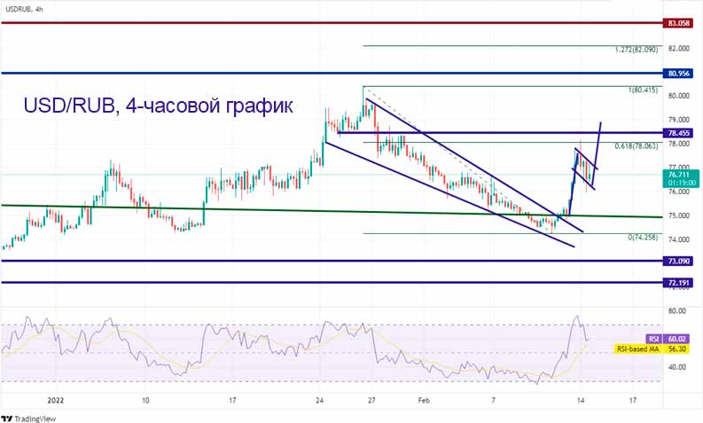 На 240-минутном таймфрейме цена снижалась с недавних максимумов в виде нисходящего клина. 10 февраля пара USD/RUB пробила верхнюю линию тренда клина и переместилась на уровень коррекции Фибоначчи 61,8% с максимумов 26 января до минимумов 10 февраля, около 78,06. Пара консолидируется в формировании флага. Цель для флага - это длина флагштока, добавленная к точке прорыва флага. В этом случае цель находится в районе 78,87.