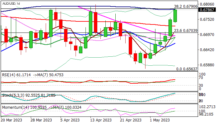 Свежее бычье ускорение подтолкнуло ценовое движение к верхней части многонедельного диапазона, чтобы оказать давление на основные барьеры на уровне 0,6790/0,6805 (Фибоначчи 38,2% от 0,7157/0,6563 медвежьей ноги /100 DMA / максимум 14 апреля), прорыв которых необходим, чтобы сигнализировать о двойном дне (0,6563/73) и развороте и открыть путь для более сильной коррекции падения 0,7157/0,6563.