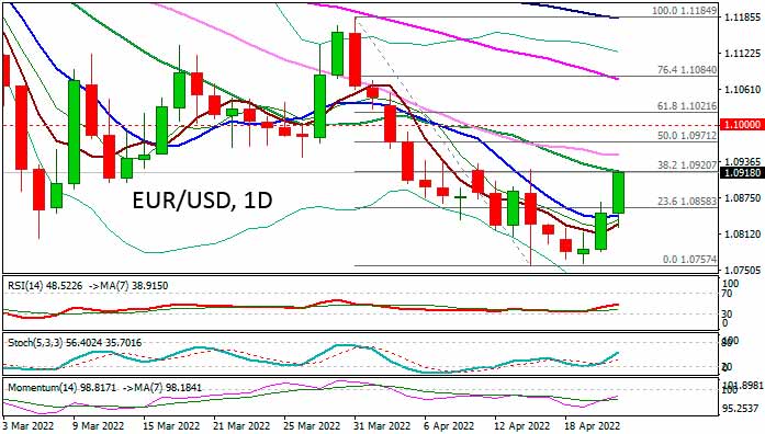 Восстановление от нового двухлетнего минимума продолжается третий день подряд и оказывает давление на ключевой барьер Фибоначчи на уровне 1.0920 (38,2% от медвежьего уровня 1.1184/1.0757, усиленный 20DMA).