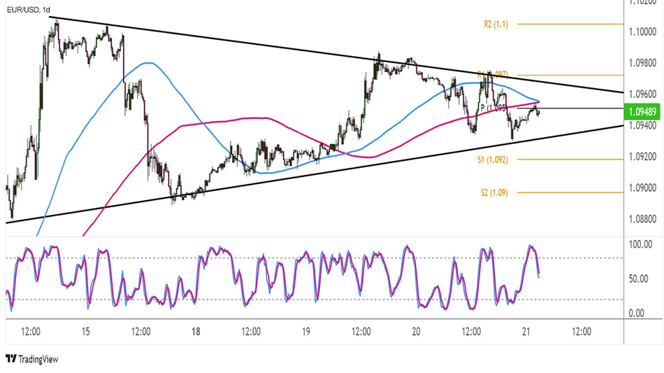 Цена держится у уровня Pivot Point (1.0950) и незначительной психологической отметки, после того как отскочила от поддержки треугольника. Продолжение подъема может привести к тестированию вершины треугольника или уровня R1 (1.0970).