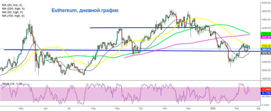 Хотя на данный момент рыночные настроения определяют цену ETH, и сегодня мы наблюдаем медвежий разворот после неудачной попытки подняться выше 50-дневной SMA. Эта скользящая средняя отклонила цену во второй раз в этом месяце, что показывает, что уровень ниже 3000 долларов удерживается, так что есть шанс, что она снова удержится после этого разворота вниз. Если снижение на этом прекратится, то мы могли бы рассмотреть возможность покупки ETH/USD там.