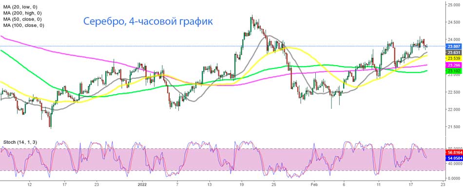 В результате Золото и Серебро тогда начали демонстрировать бычий настрой и продолжают восходящий импульс. Бычий импульс усилился в этом месяце, в частности, потому, что напряженность в Украине все еще сохраняет напряженную ситуацию. Пара XAU/USD торговалась на отметке 1780 долларов в конце января, когда началось это сильное бычье движение, которое подняло цену до 1910 долларов ранее сегодня. В течение этого времени 20 SMA (серая) выступала в качестве основного индикатора поддержки, удерживая цену во время откатов, поэтому мы думаем о покупке золота там, если нисходящий откат последних нескольких часов продолжится.