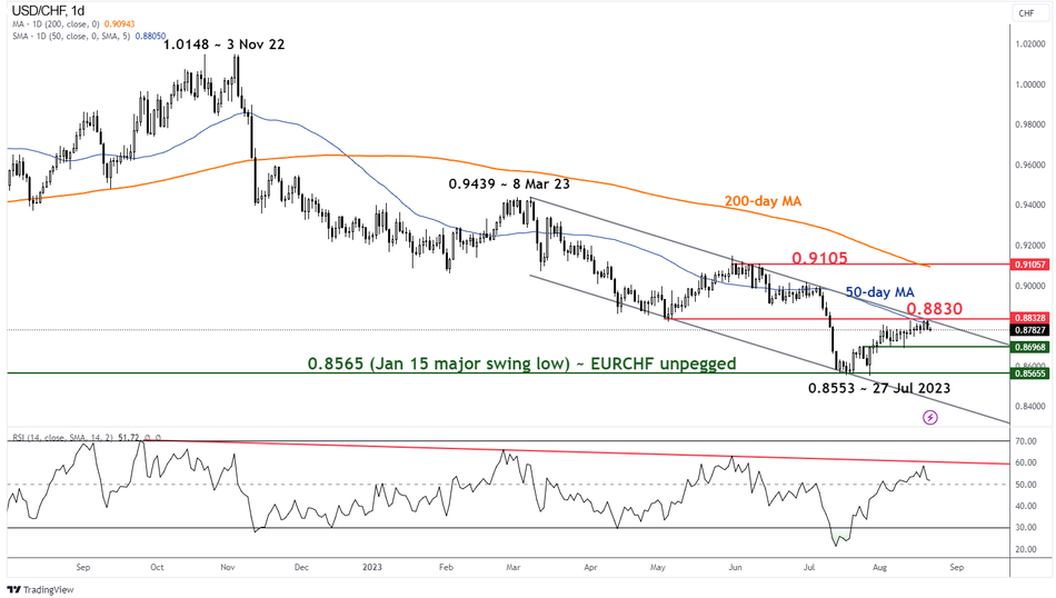 Следите за ключевым краткосрочным ключевым сопротивлением 0.8800, прорывом ниже краткосрочной поддержки 0.8755 (также 20-дневной скользящей средней), обнажающей следующую поддержку на 0.8700 (незначительные колебательные минимумы от 4/10 августа 2023 года) на первом этапе.